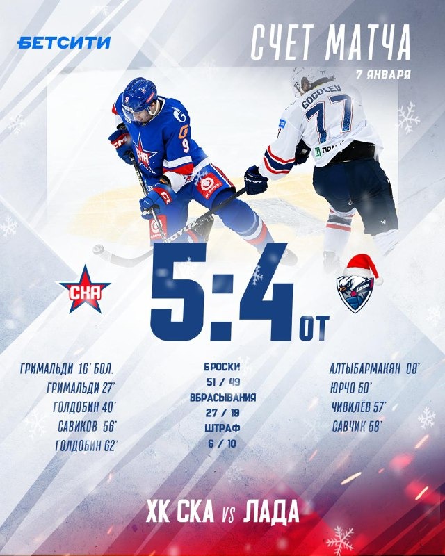 На стадионе «Ледовый дворец» в Санкт-Петербурге прошёл очередной матч регулярного чемпионата Континентальной хоккейной лиги между СКА и тольяттинской «Ладой». Встреча завершилась победой хозяев в овертайме со счётом 5:4.
