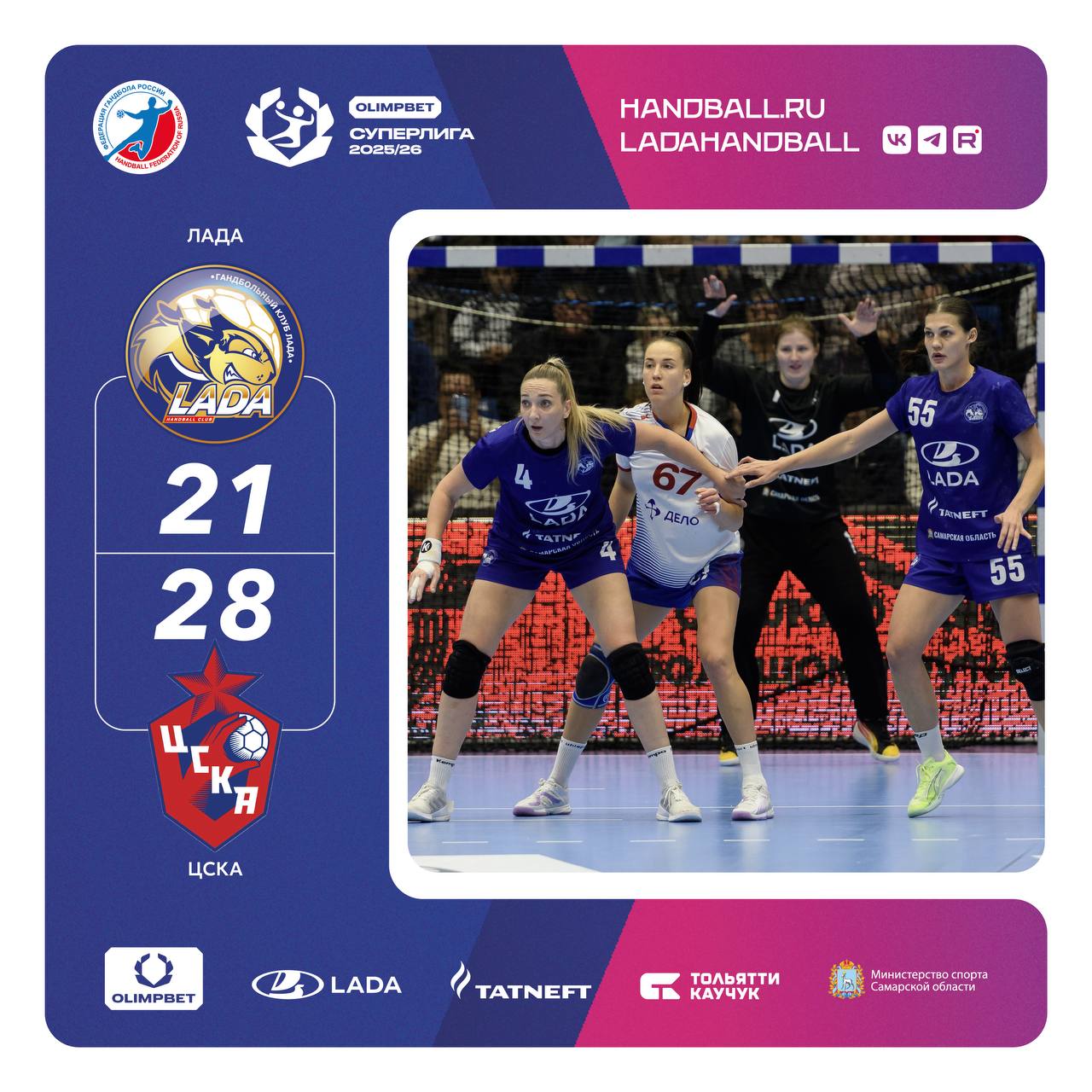 Матч OLIMPBET Суперлига 2025/2026 «ЛАДА» - ЦСКА завершился со счетом 21:28 в пользу гостей.