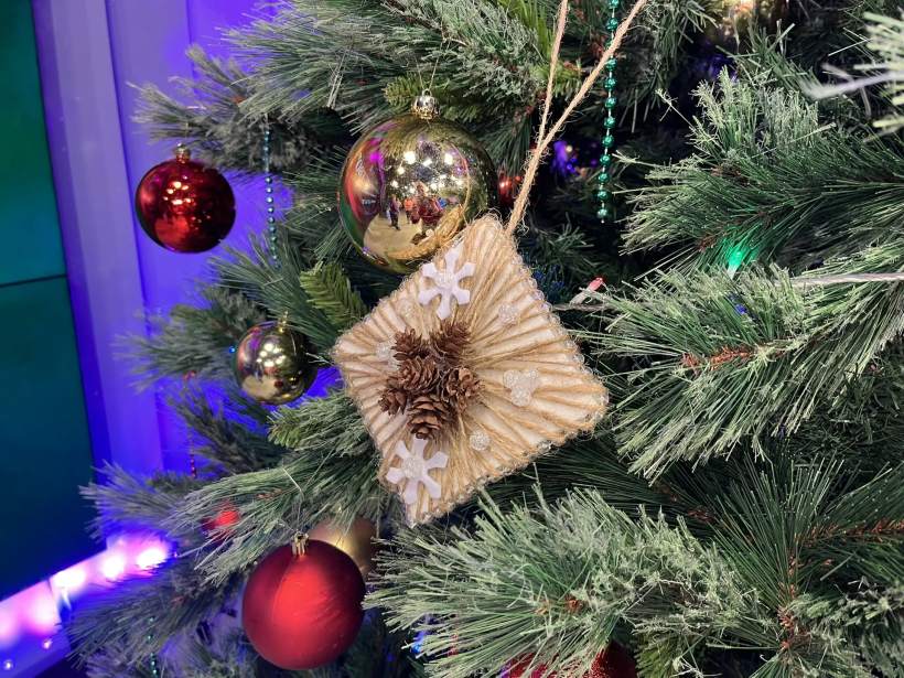 А сегодня на церемонии награждения Ольга и Людмила подарили нам экоигрушку – новогоднюю игрушку, созданную своими руками из натуральных материалов! Ирина Викторовна тут же разместила подарок на нашей ёлке в студии