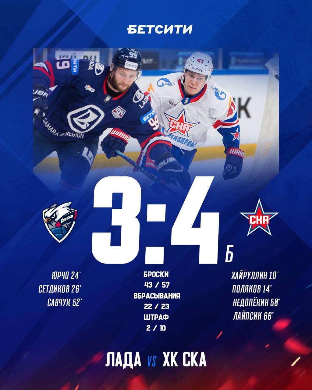 В матче основное время завершилось при равном счете 3:3. В овертайме никто из соперников забросить не смог, а в серии буллитов точнее оказались игроки СКА.