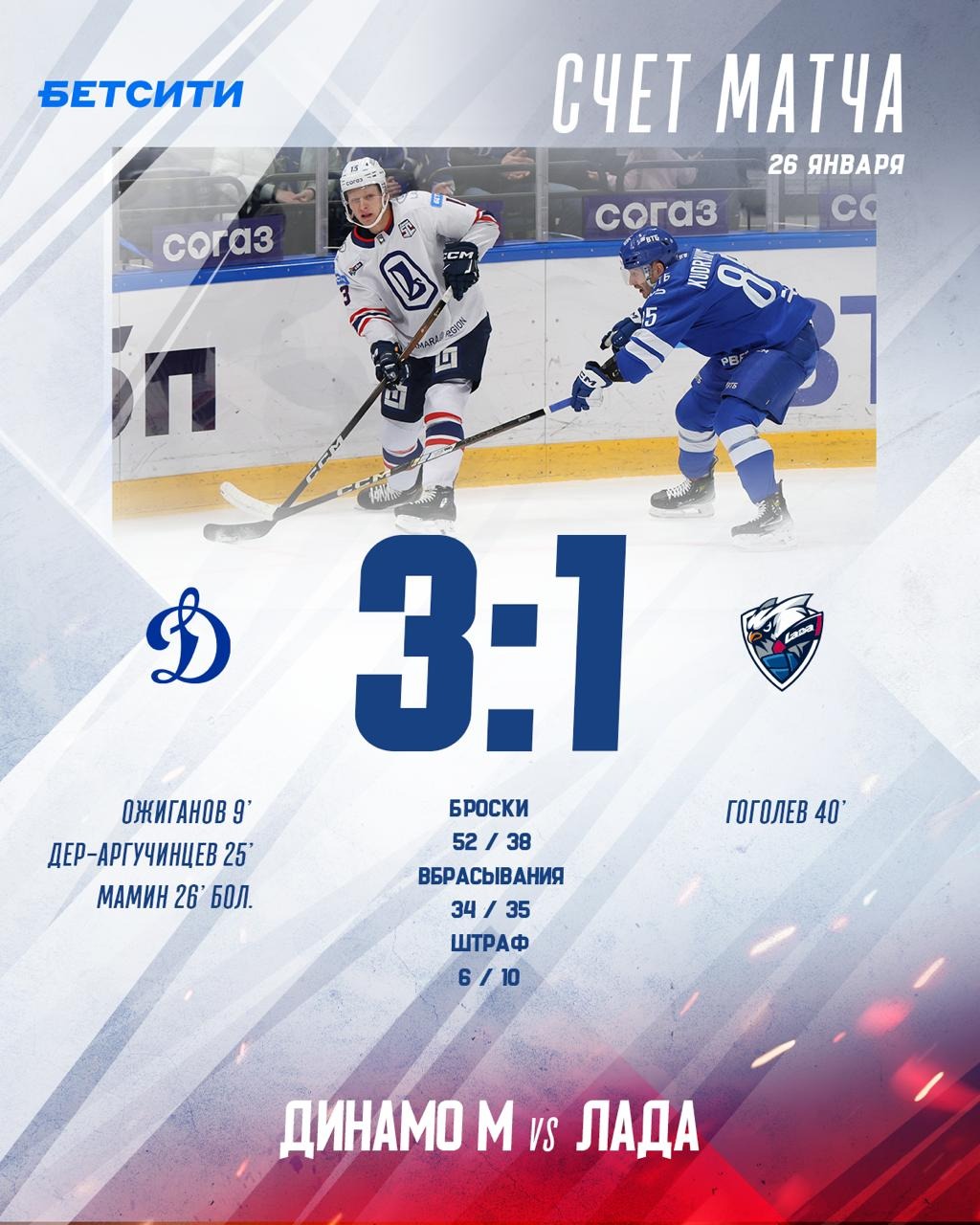 В Москве завершился матч регулярного чемпионата КХЛ, где в гостях играла тольяттинская «Лада» против «Динамо». Победу в игре одержали хозяева со счётом 3:1.