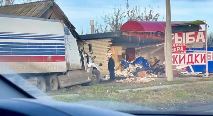На дороге в Переволоках грузовой автомобиль врезался в палатку, где судя по вывеске, продавалась рыба.