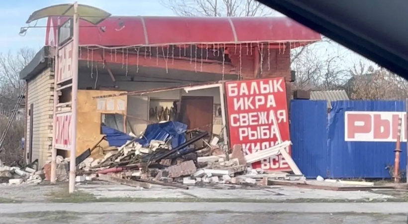 Работал эвакуатор, который оттащил машину с места аварии. Кирпичная палатка и крыша сильно разрушены.