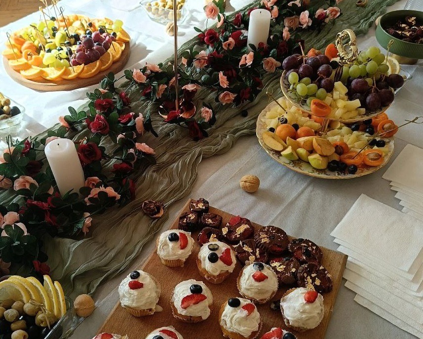 Десерт: фрукты (апельсины, мандарины, яблоки, виноград) — 892 руб., торт — 718 руб.