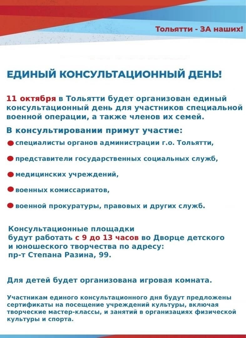 11 октября в Тольятти состоится единый консультационный день для участников СВО и членов их семей. Ветераны специальной военной операции, а также их родные и близкие смогут проконсультироваться со специалистами профильных служб по интересующим их вопросам.