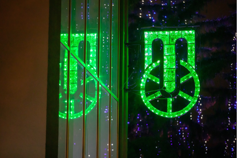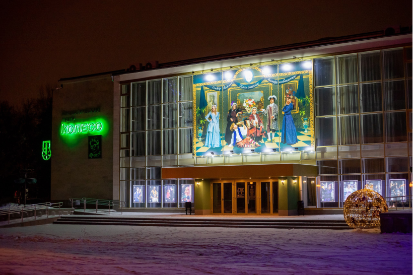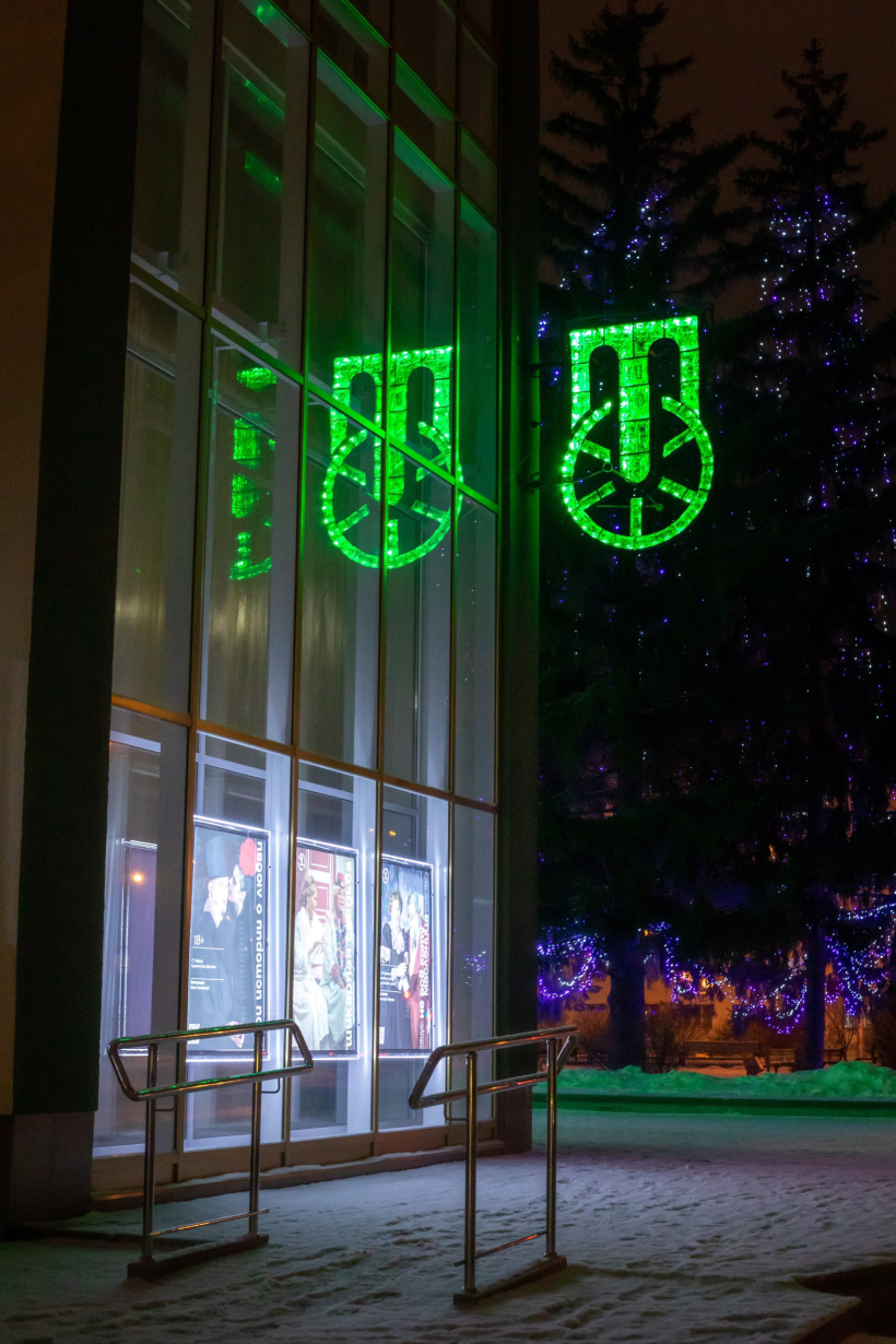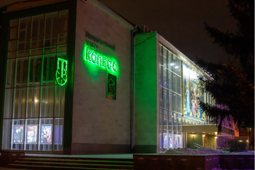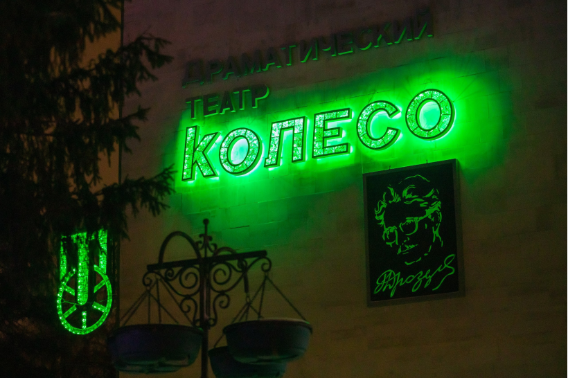 Вечером возле театра «Колесо» очень красиво. Так теперь выглядят отреставрированные буквы и логотип театра.
